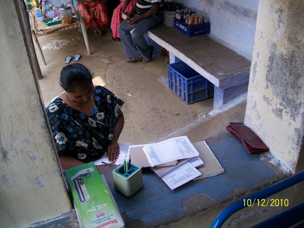 The Health supervisor and his team of three Health Workers visit residents of Madayankuttai village at Mettur on 09 December. Ten famalies of 50 members were enumerated (25 Males, 20 Women, 3 Male Children and 2 Female Children-Four pictures). Clinic on 10 December was conducted and a middle aged lady was treated for surgical dressing operated at Coimbatore. Picture shows patient with healing wound after sepsis, left foot. A. Maliga health worker at Navapatty Centre registration of patients. (Three pictures)
